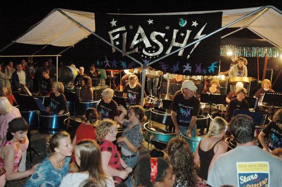 In 1990, Carl put an ad in the local paper inviting people to come to an adult education class at George Stevens Academy in Blue Hill to learn to play the steel drum. A few semesters and several outdoor gigs later, Flash in the Pans Community Steelband was born. Under the musical direction of Carl and his son Nigel Chase, FLASH! has grown to become one of the largest community-based steelbands in the country.